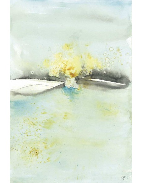 A work made with watercolors in water green with yellow and dark stains, made by the artist Marta Castet Bellocq
