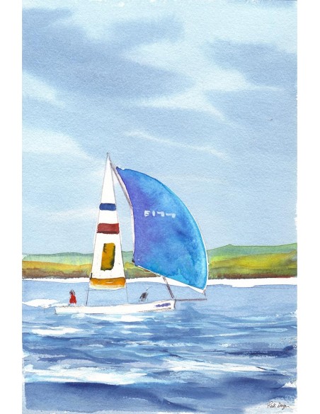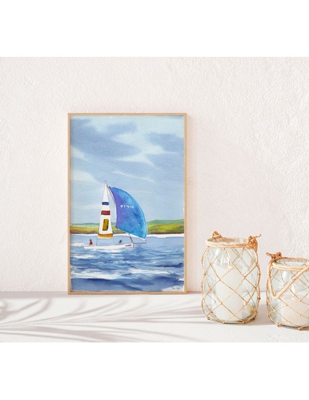 Seascape with sailboat with wide blue sail in the sea. Design by Ruth Design.