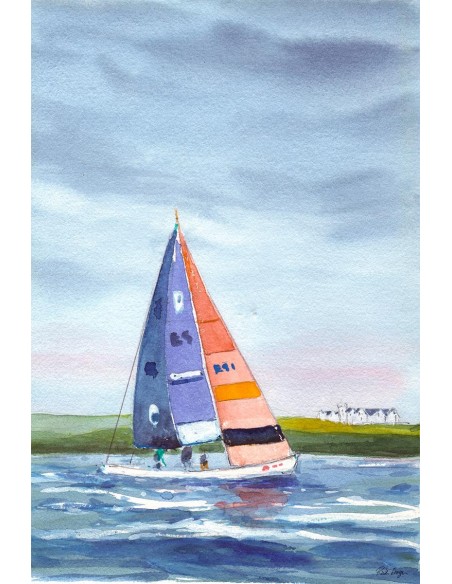 Image of sailboat with blue and orange sails on the high seas. Other sailboats available. Design by Ruth Design.