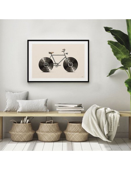 Retro image of a bicycle with vinyl on the wheels designed by Florent Bodart. Ideal to form a collage