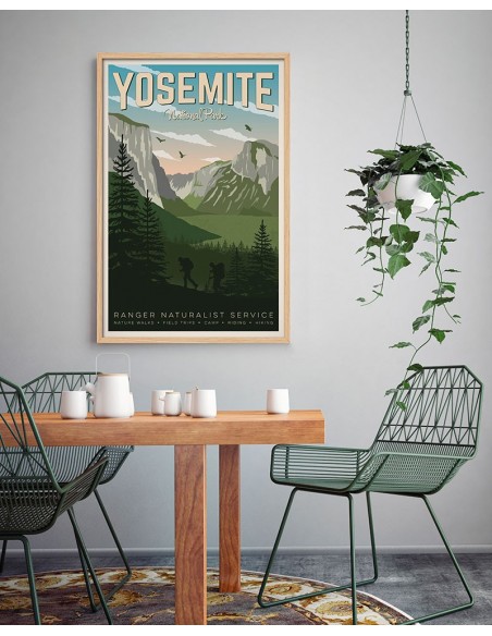 Poster for Yosemite National Park, with its cliffs and green meadows. A design made by Travel Studio to have the park in your home