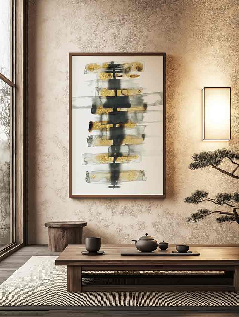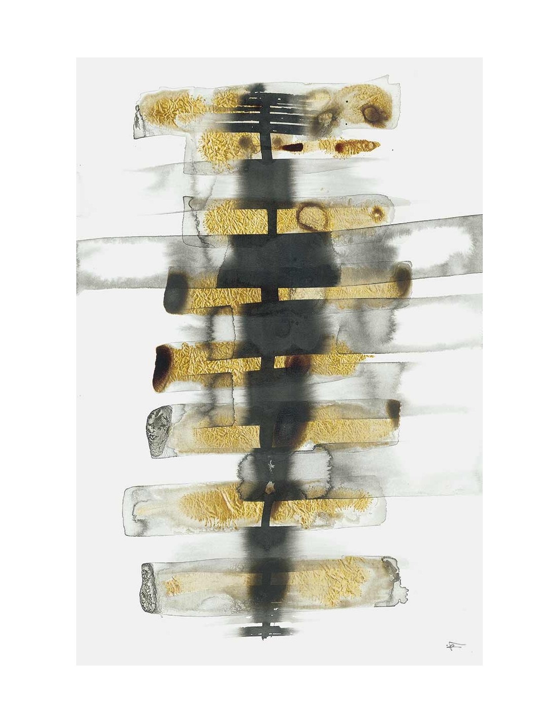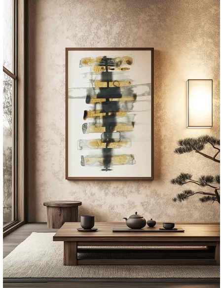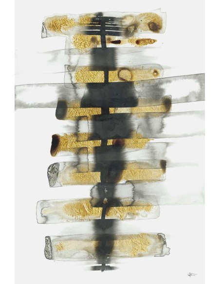 Unas manchas de tinta negra, impacta su sencillez a la vez que su elegancia. Obra en la que hemos incluido trazos dorados como diseño que forma parte de la colección "Brillante". Una obra de Marta Castet Bellocq.