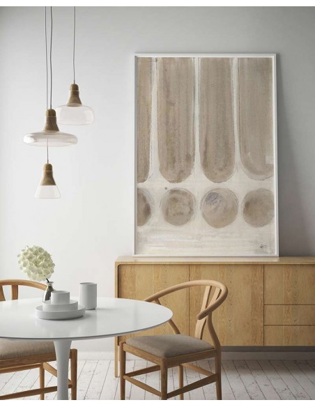 Diseño modernista basado en formas redondeadas y círculos de colores cálidos sobre fondo neutro. Reproducción del diseño original vanguardista de la artista Marta Castet Bellocq. Disponibles en diferentes tamaños y acabados.
