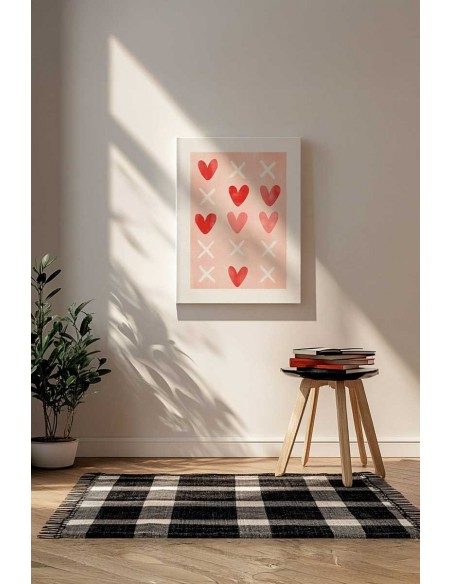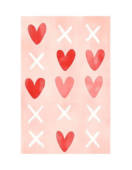 Diseño "Carta Corazones" presenta un patrón de corazones en tonos rojos y rosas, intercalados con cruces blancas sobre un fondo suave de color rosa.