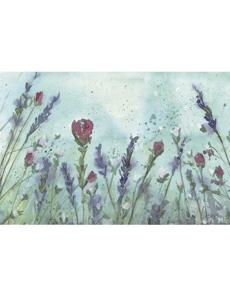 Paisaje floral con flores en tono rojo sobre fondo azul, reproducción de la obra original de Marta Castet Bellocq.