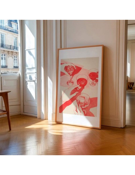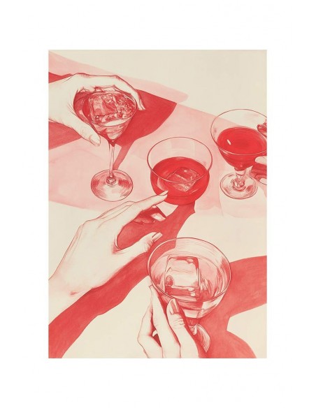 El diseño está hecho en un tono rojo vibrante que resalta tanto las copas como las manos, creando un ambiente elegante y dinámico. La sombra y el contraste de los objetos ofrecen una sensación de profundidad, dándole un toque sofisticado y moderno. Reproducción artesanal y fabricado en España