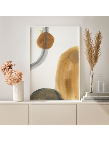 Cuadro abstracto en tono mostaza y gris reproducción de la obra de Marta Castet Bellocq. Título "Diseño"