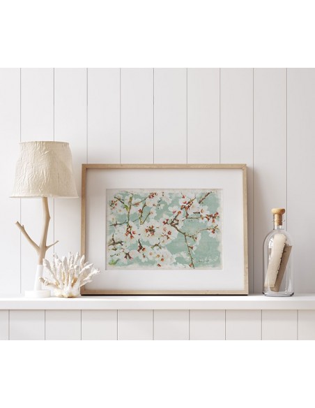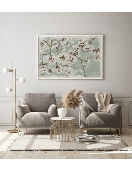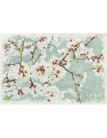 Delicadas flores flores de almendro en turquesa y blanco.