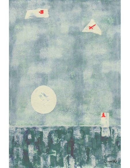 Astracto con tonos azules combinados con verdes y pinceladas rojas. Una obra moderna con fuerza estética combinable con otras obras de la artista Elene Camacho. Disponible en varios acabados y medidas.