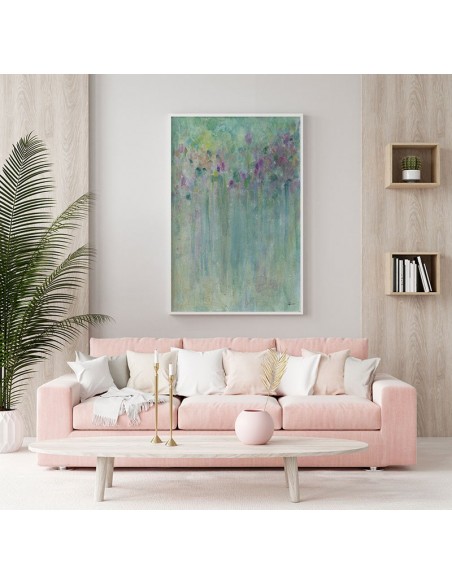 Abstracto en turquesa donde se vislumbran pequeñas flores rosas. Artista: Marta Castet Bellocq