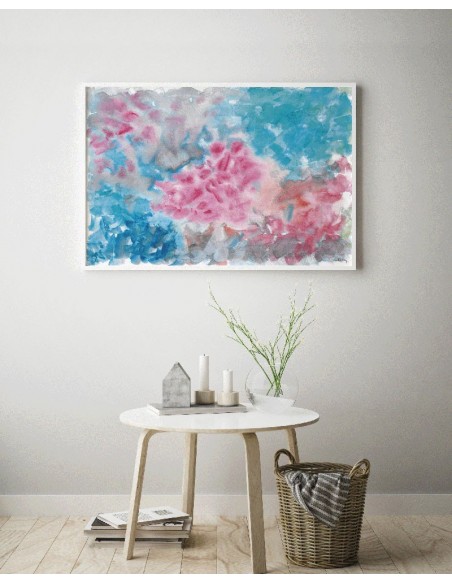 Grandes manchas turquesas y rosas que quieren ser flores difuminadas y donde la belleza está en la intuición. Impresión del original de Marta Castet Bellocq