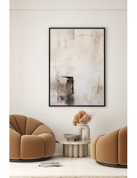 Abstracto basado en juego de manchas y líneas. Diseño en tonos neutros y cálidos. Perfecto para transmitir calma en espacios únicos. Reproducción de la obra original del artista Bruno Vázquez. Disponible en varios tamaños y acabados.