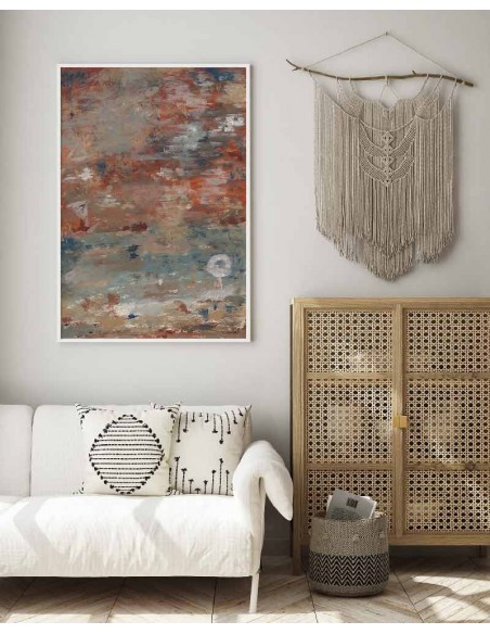 Diseño en formato rectangular vertical en tonos rojizos. Reproducción de la obra original de Elena Camacho. Un diseño abstracto que comunica un mensaje de la naturaleza. Disponible en varios acabados y medidas.
