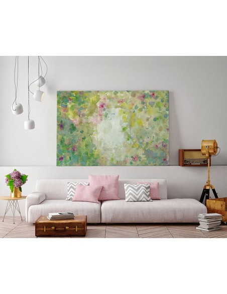 Cuadro "Mi Patio". Abstracto floral con pedominio de verdes y mucha luminosisdad. Artista: Marta Castet Bellocq.