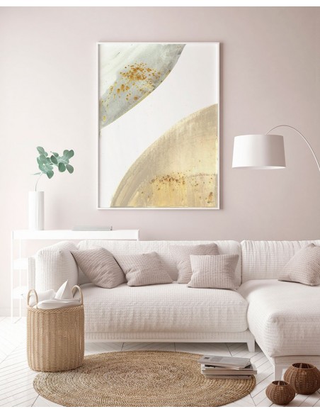 Abstracto "Mundos" reproducción de la obra de Marta Castet Bellocq en tono mostaza y gris.
