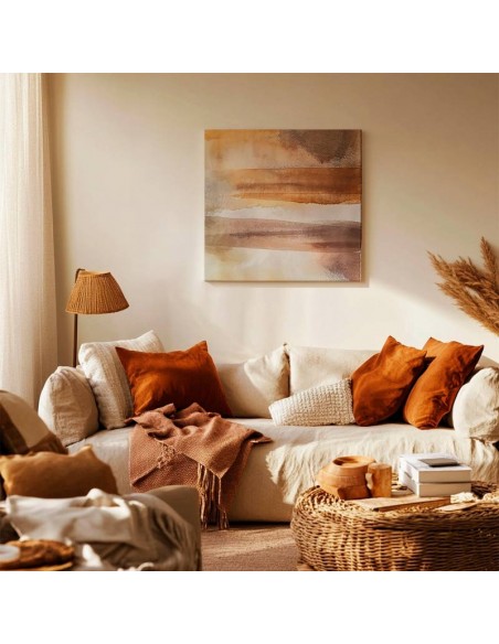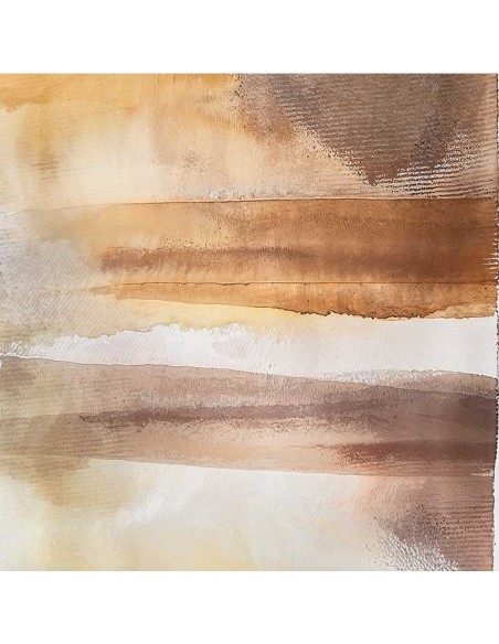 Con una pincelada horizontal que sugieren el movimiento y profundidad, la paleta de colores es cálida y suave, dominada por tonos ocres, marrones y naranjas.