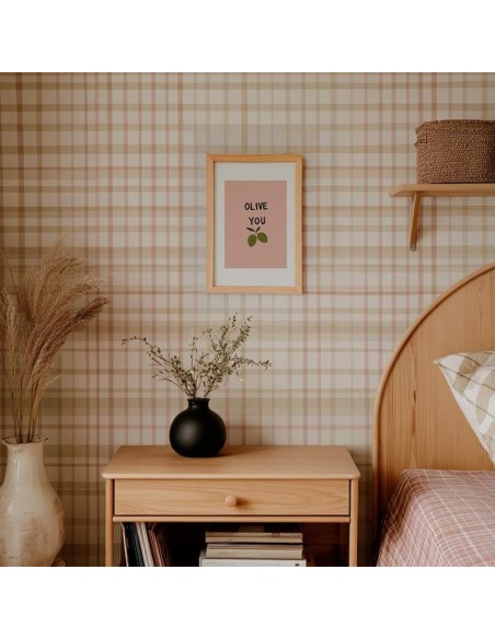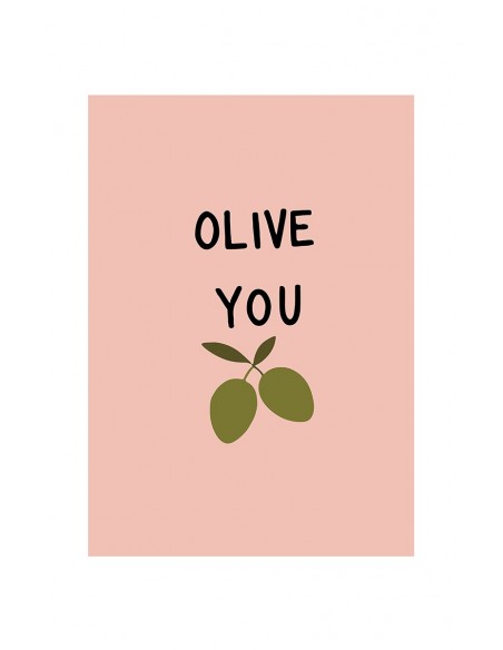 Ilustración "Olive You II" con una fondo rosa suave cuenta con un mensaje divertido con un juego de palabras con "olive" (aceituna) en lugar de "I love you" (te quiero). Reproducción artesanal y fabricado en España