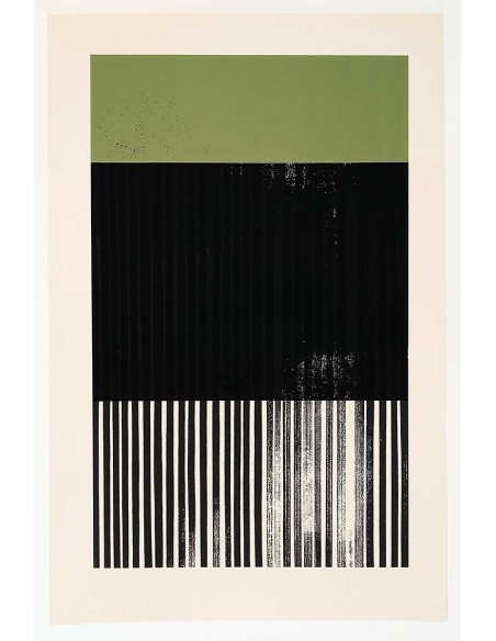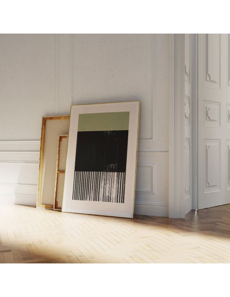 El cuadro "Paisaje en clave" es una obra de arte abstracto moderna y equilibrada. La franja superior, en un verde oliva sólido, transmite una sensación de naturaleza contenida. El bloque central, negro con sutiles texturas verticales y finalmente, la sección inferior, compuesta por líneas negras verticales sobre fondo blanco, recuerda a un código en clave que aporta dinamismo.