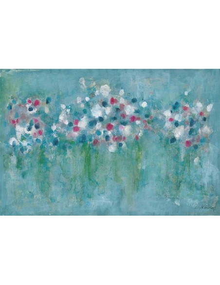 "Papabel", alineación de ramos de flores abstractos sobre un fondo irreal turquesa. Reproducción de la obra de Marta Castet Bellocq