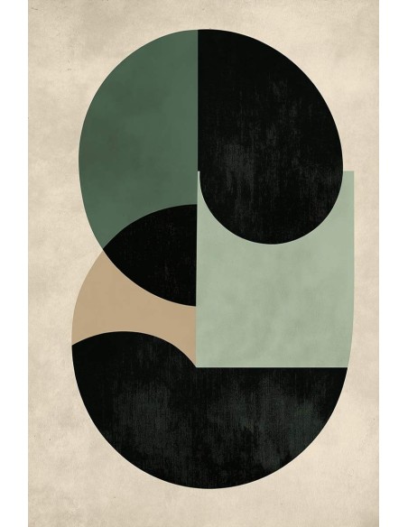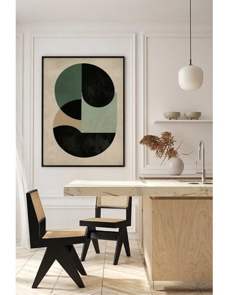 Descubre la obra " Reunión de Círculos" que combina tonos sobrios y terrosos como el negro mate, dos tonos de verde, un beige arena. Estos colores no compiten entre sí, sino que se complementan, creando una armonía visual. Este cuadro muestra formas geométricas superpuestas y entrelazadas con predominio de las curvas. Un cuadro que contribuye a un efecto de serenidad y equilibrio de cualquier estancia.