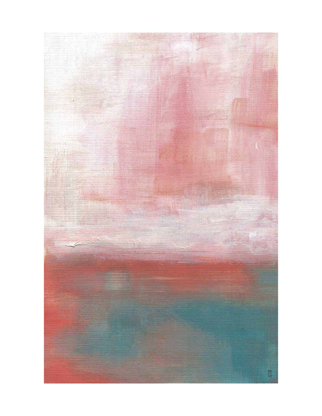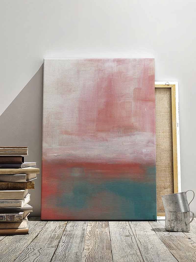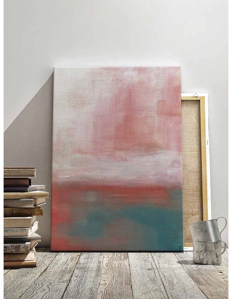 Diseño abstracto a través de pinceladas de colores pastel, rosados y turquesas, que evocan calma. Reproducción del diseño original realizado por el César Ortiz. Ideal para espacios que buscan transmitir tranquilidad. Perfecta para decorar salas, dormitorios u oficinas con un aire moderno y elegante. Disponible en varios tamaños y acabados.