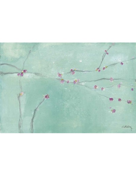 Cuadro abstracto que dejar intuir pequeñas flores rosas. Artista: Marta Castet Bellocq