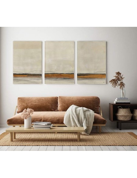 Tríptico inspirado en paisaje cálido con colores neutros y terracota. Reproducción de la obra original de la artista Marta Castet Bellocq.