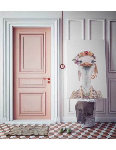 Divertido diseño de avestruz con tocado de flores de colores multicolor para dar un aire diverrtido y original a cualquier espacio. Reproducción del diseño de César Ortiz Echagüe