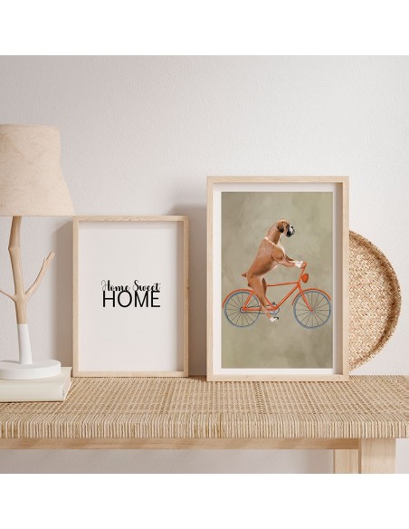 Cuadro de perro boxer subido en bicicleta. Diseño realizado por Coco de Paris. Una reproducción divertida que podrás adquirir en el tamaño y el acabado que quieras.