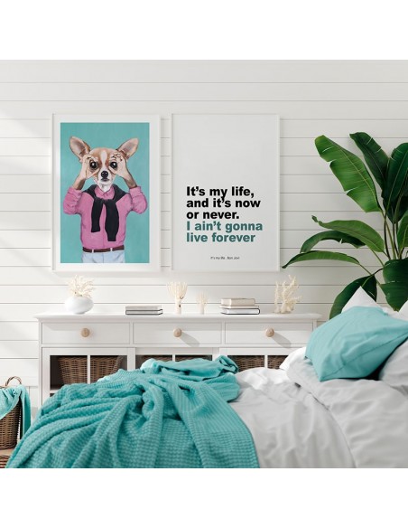 Diseño de perro Chihuahua vestido con camisa rosa fijando la mirada. Un cuadro divertido para los amantes de los animales