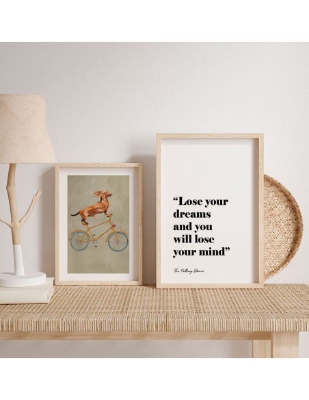 Cuadro decorativo de perro salchicha montando en bicicleta en color marrón. Reproducción del diseño de Coco de Paris.