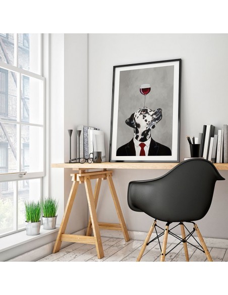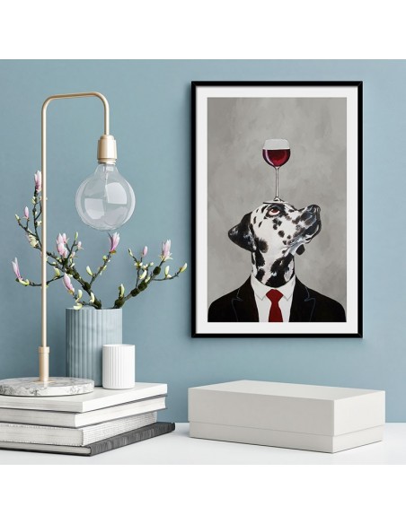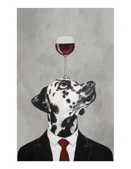 Elegante imagen de perro dálmata vestido de traje sujetando una copa de vino en la cabeza. Diseño realizado por Coco de Paris