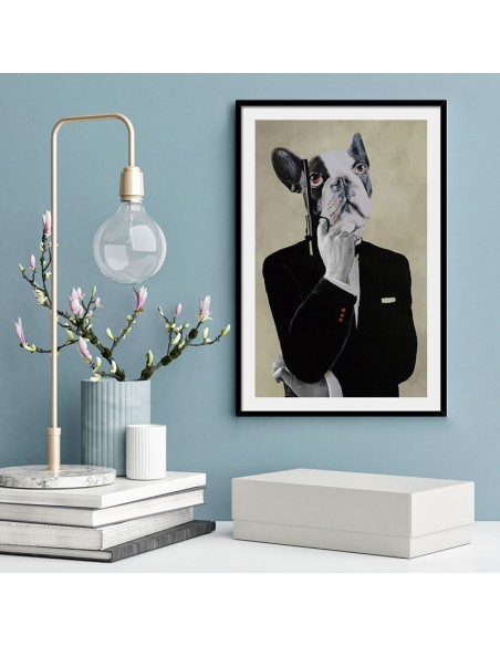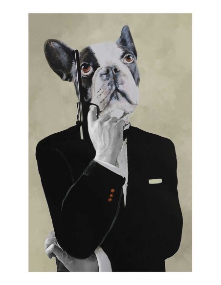 Imagen de perro buldog con traje y pistola al más puro estilo James Bond. Un cuadro diseñado por Coco de Paris, maestro en dar vida a los animales. Disponibles en varios acabados.