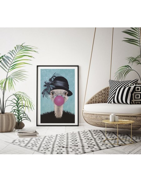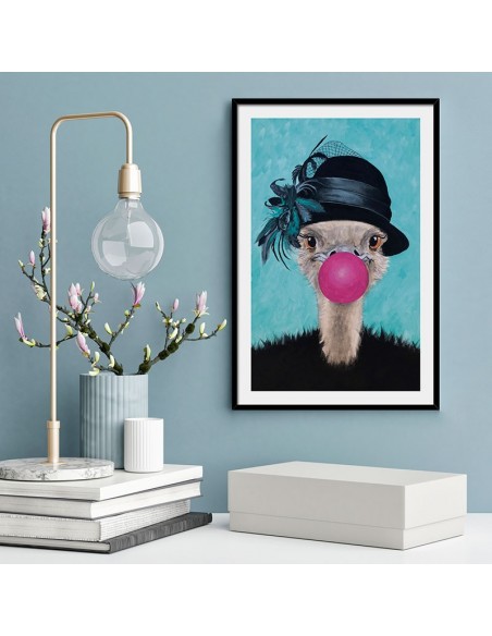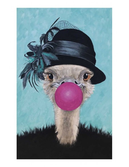 Divertida imagen de Avestruz con sombrero y globo de chicle en la boca. Una personificación de los animales realizada por Coco de Paris para los más atrevidos.