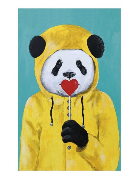 Imagen de un Panda con chubasquero amarillo y una piruleta en forma de corazón. Un cuadro muy decorativo, reproducción del diseño original de Coco de Paris