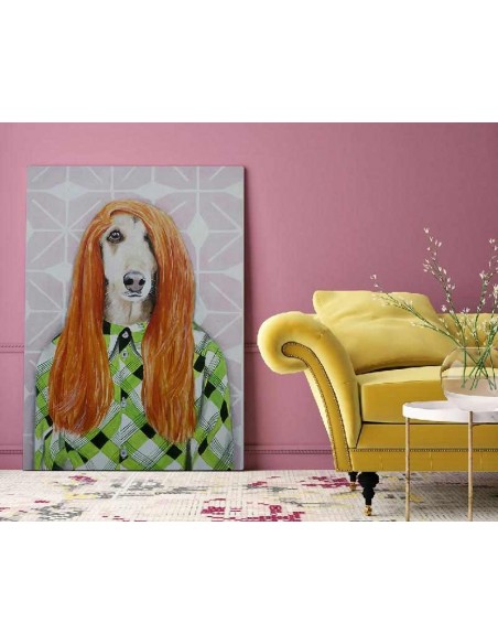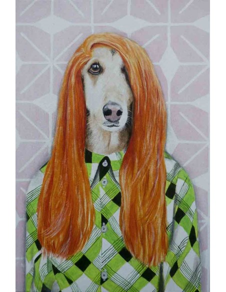 Reproducción de la obra original Afghan Dog Retro de Coco de Paris. Artista que representa a animales en divertidas escensa humanas. En este caso un perro vestido con un estilo retro. Disponibles en diferentes tamaños y acabados. Ideal para combinar con otros diseños del artista.