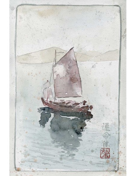 Paisaje nipón de barco velero reflejado en el agua