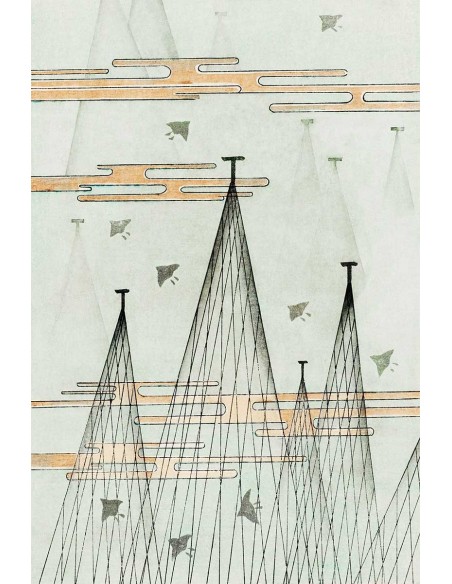 Paisaje urbano en tonos verdes con pájaros sobrevolando los minaretes