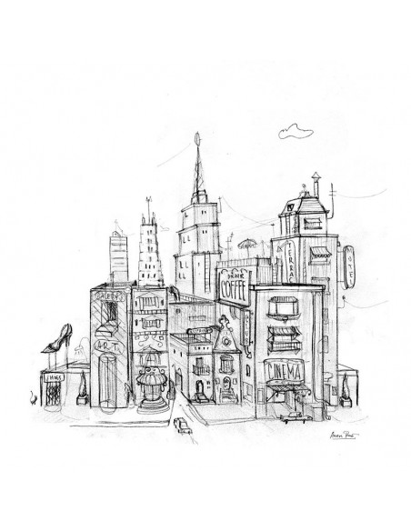 Diseño de fachada, tipo postal en blanco y negro realizado por la artista Aurora Rumi