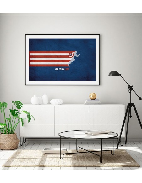 Cuadro decorativo en color azul y rojo con el Capitán América para los amantes del cine. Reproducción de la obra de James Lucido.