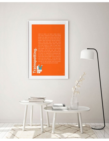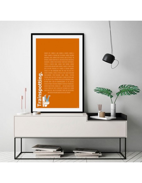 Reproducción de la obra del artista Vincent Hede. Cuadro decorativo Trainspotting con fondo naranja. Disponible en varios tamaños