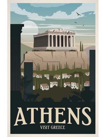 Vista de Atenas con el partenon al fondo en color blanco. Un diseño de Travel Studio que invita a conocer la ciudad