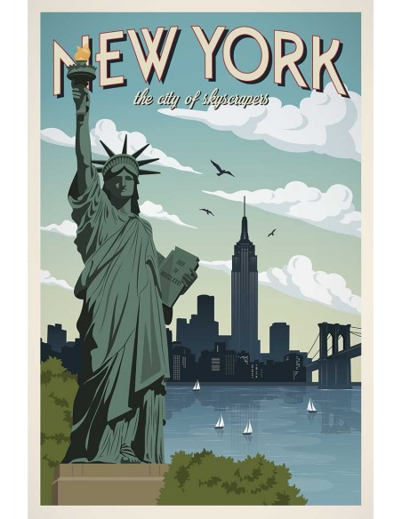 Cartel de la Ciudad de Nueva York con la estatua de la Libertad en primer plano y los rascacielos al fondo. Diseño realizado por Travel Studio.