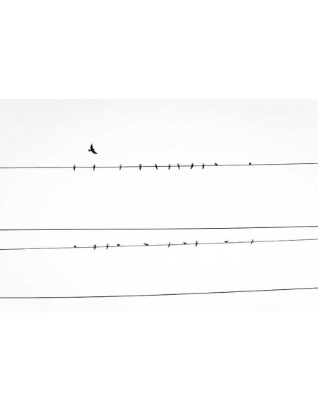 Fotografía de unas aves descansando sobre un conjunto de cables en estilo minimalista.