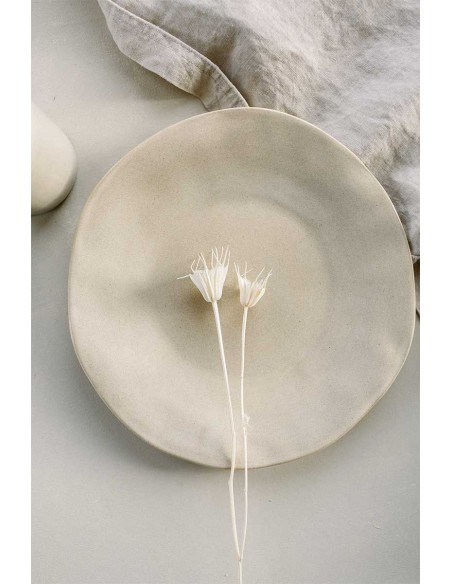 Fotografía de un elegante plato de cerámica, con bordes sutilmente irregulares.Un diseño que aporta calidez y autenticidad, ideal para decorar cualquier espacio. Disponible en varios tamaños y acabados.