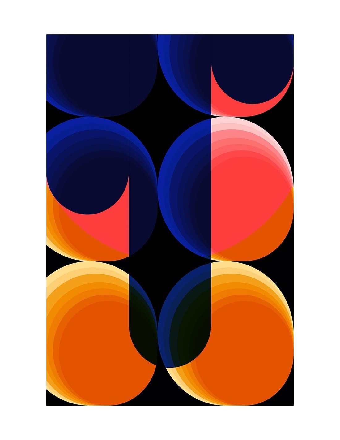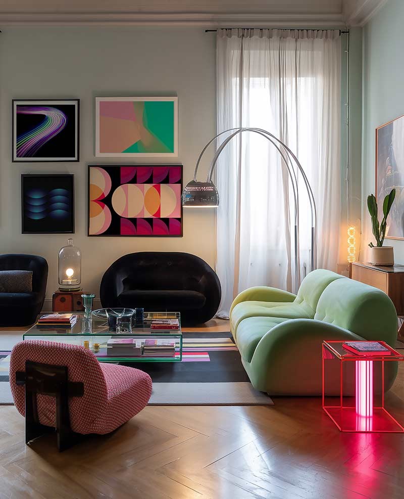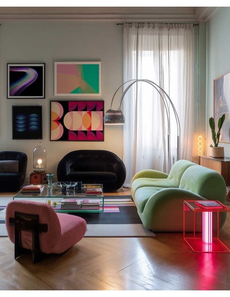 Diseño moderno de líneas curvas a base de colores neón. Disponible en diferentes tamaños y acabados.