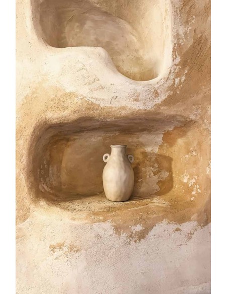 Fotografía en tonos claros, de un rincón con una pared arcillosa y una jarra como elemento de decoración. Disponible en varios tamaños y acabados.