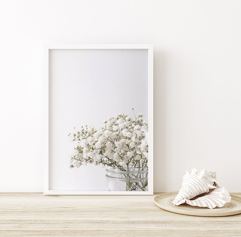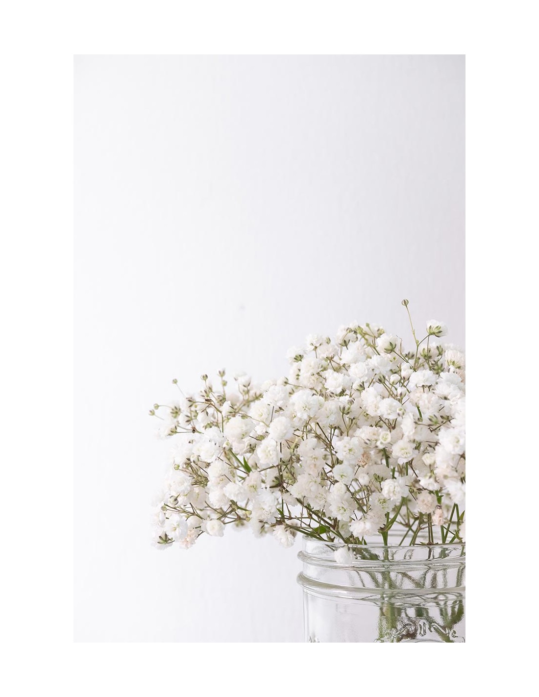 Vista en primer plano de jarrón transparente con Paniculata. El proganista de esta imagen es el color blanco que aporta luminosidad y frescura a la imagen