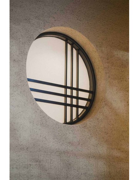 Dale un toque contemporáneo a tus espacios con esta fotofrafía de un aplique de pared de diseño circular. Una estructura metálica negra con líneas geométricas aportando carácter y elegancia. Ideal para decorar interiores modernos, que buscan un acento decorativo con personalidad. Disponible en varios tamaños y acabados.