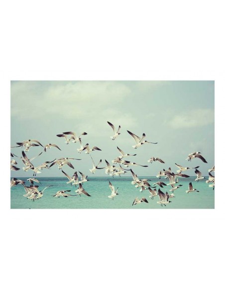 Una fotografía que captura unas gaviotas al vuelo en una playa de ensueño. Elige el tamaño y acabado que más te guste.